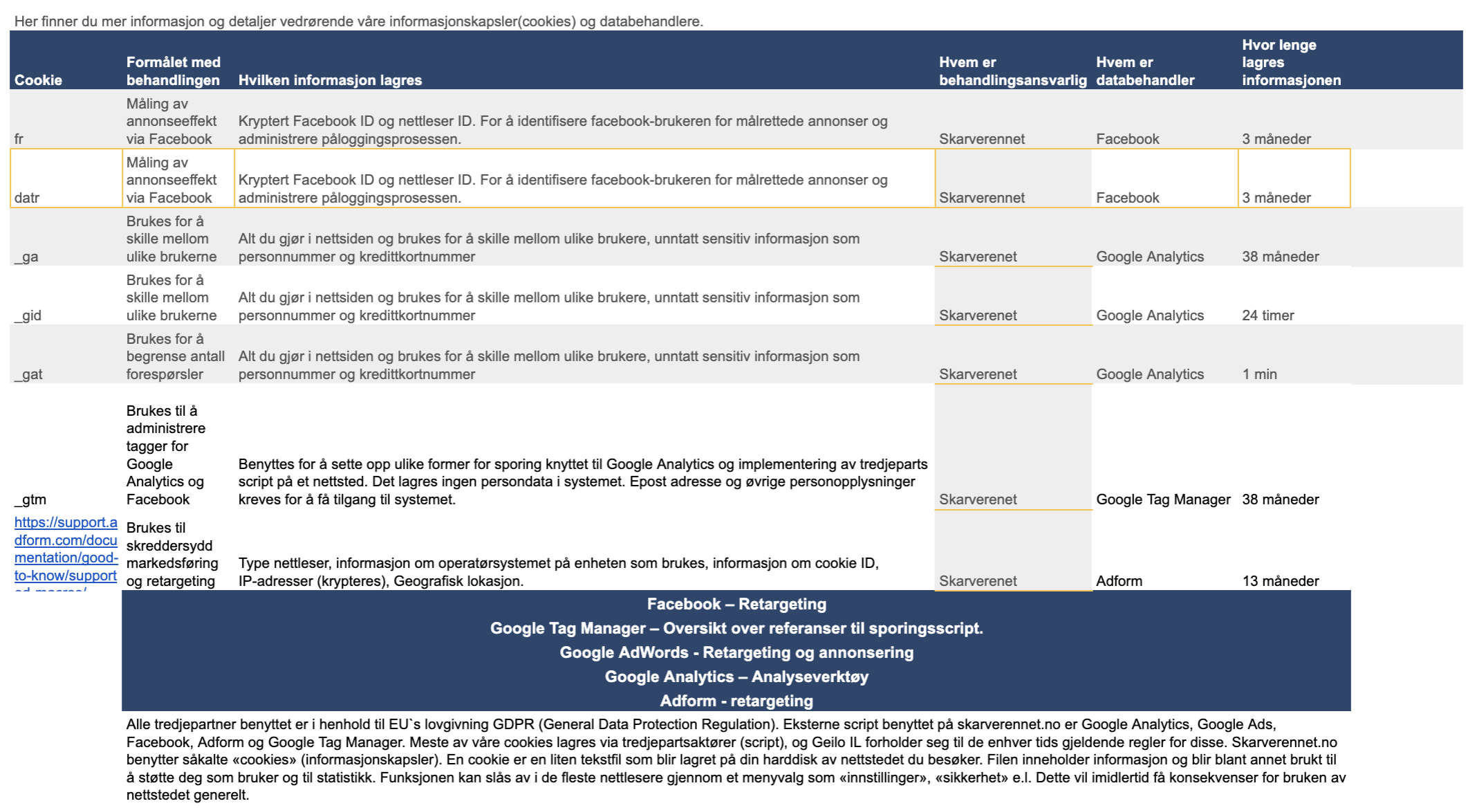 Vi bruker informasjon om hvordan våre besøkende bruker våre Nettsteder, Apper og Tjenester for å kunne forstå kundeadferd eller preferanser. Vi kan for eksempel bruke informasjon om hvordan besøkende på skarverennet.no søker etter- og finner produkter